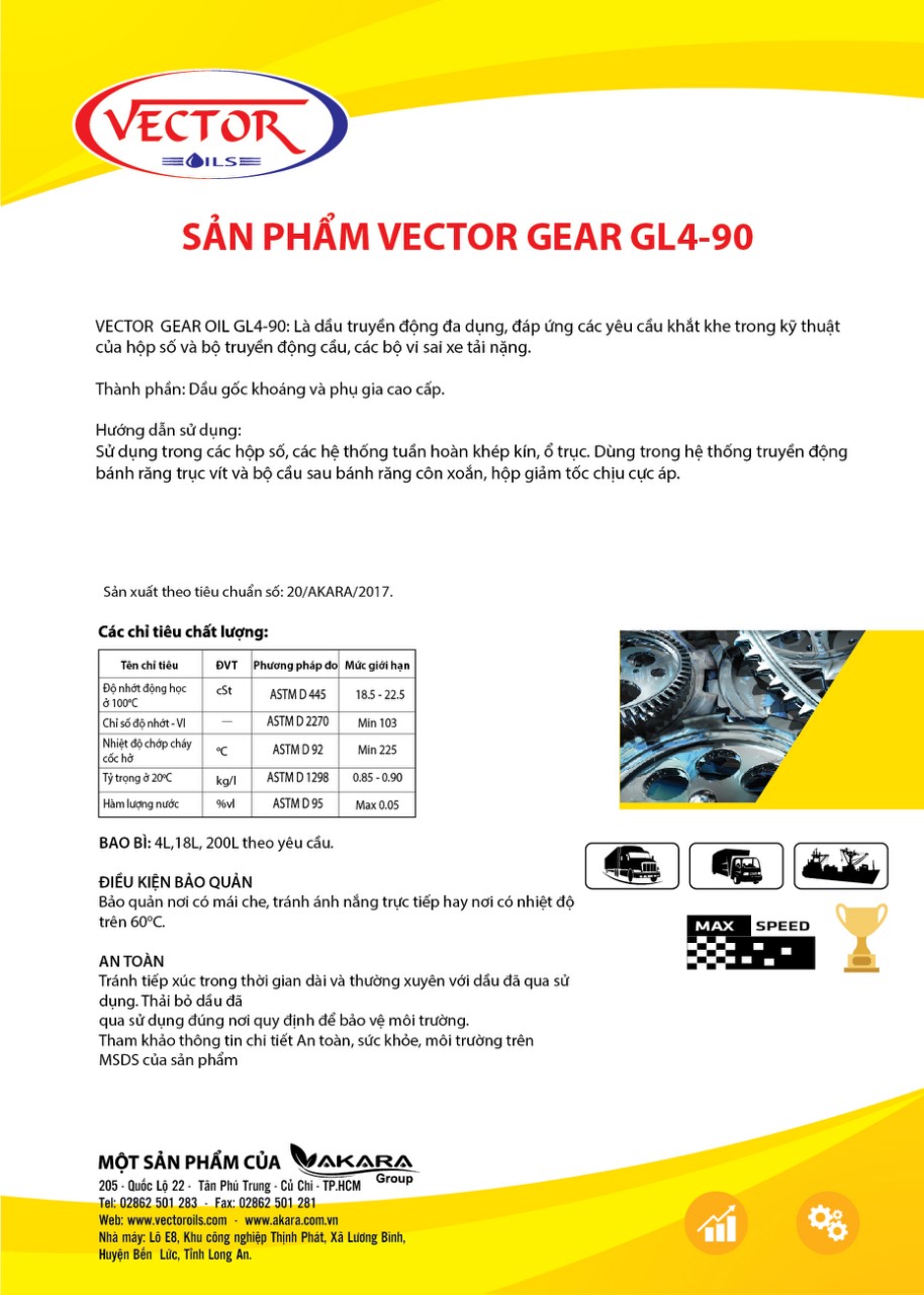 Đặc tính: VECTOR GEAR OIL 90 là dầu bánh răng hộp số và truyền động đa dụng, đáp ứng các yêu cầu khắt khe trong kỹ thuật hộp số và bánh răng. Được sản xuất từ dầu khoáng gốc chống Oxi hóa, giúp bôi trơn và bảo vệ động cơ bánh răng hộp số hoàn hảo